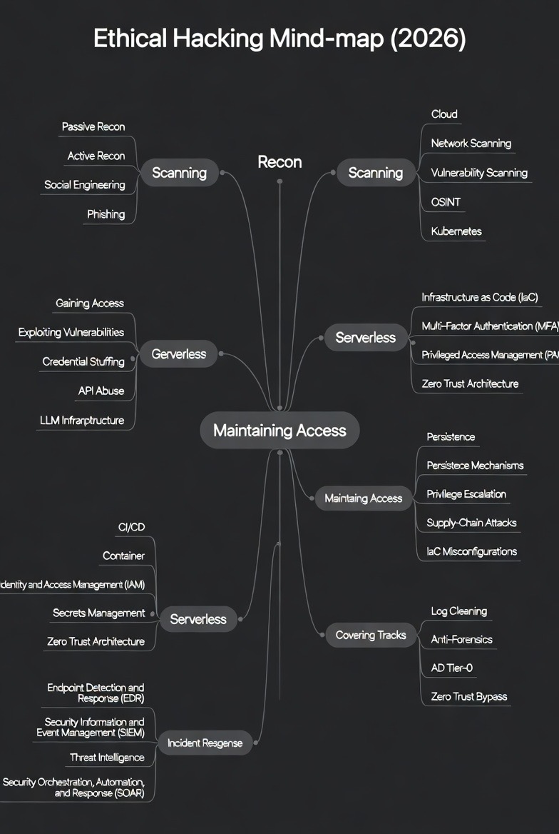 Discover the complete Ethical Hacking Mind Map 2026 – from Recon & Scanning to Gaining Access, Maintaining Persistence, Covering Tracks + 2026 trends: LLM prompt injection, AI-powered attacks, IaC misconfigs, supply-chain exploits, AD Tier-0 compromise, cloud-native pentesting & zero-trust bypasses. Perfect visual guide for beginners to pros learning cybersecurity & penetration testing in 2026!